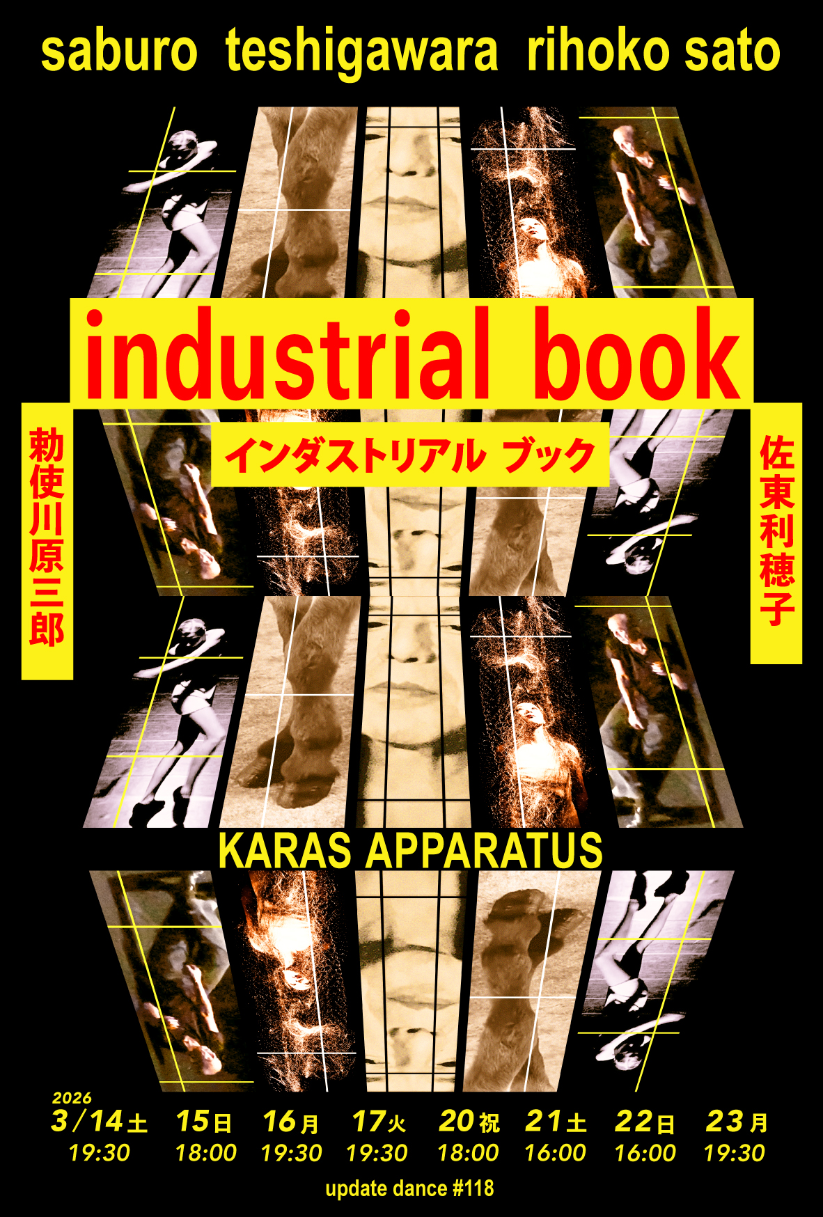 *3月7・8日に予定しておりましたアップデイトダンスNo.118「猫」は宮田まゆみ氏の体調不良を考慮し、公演を中止いたします。予定を変更し、新作「インダストリアル ブック」をアップデイトダンスNo.118として3/14より上演いたします。宮田まゆみ氏との共演については、今後の実現にむけて、また新たに準備を進めてまいります。KARAS